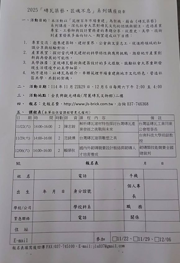 四、 報名:免報名費,http://www.jls-brick.com.tw,洽詢037-746368